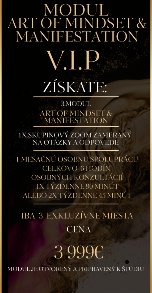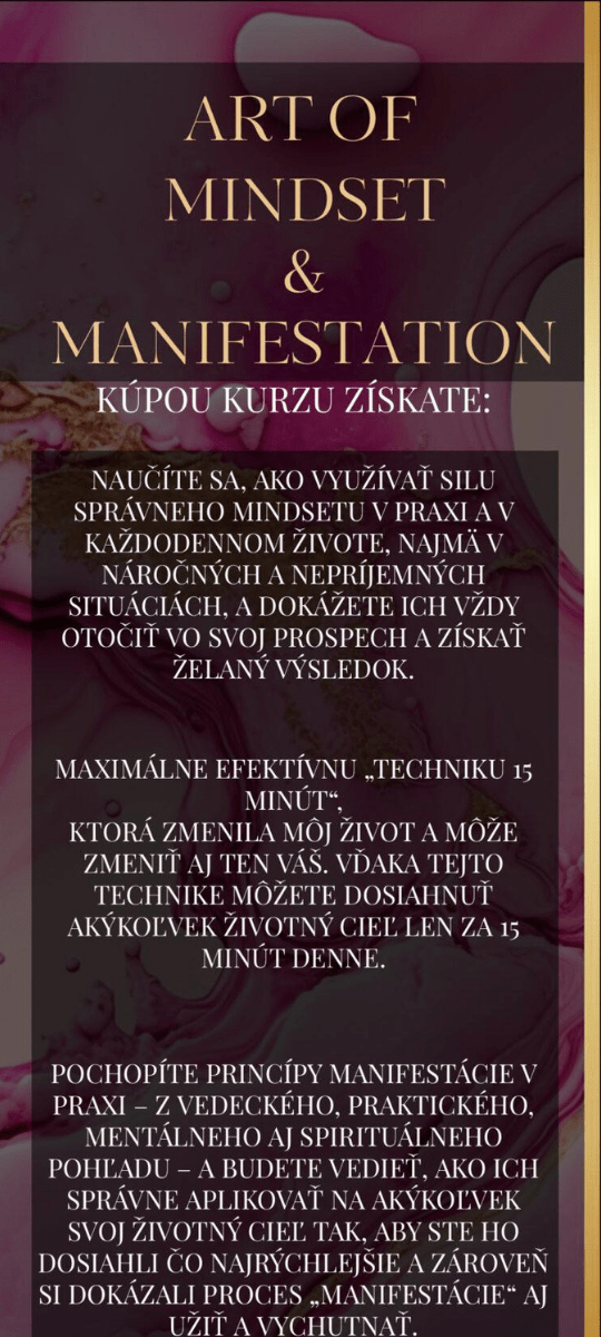 Naučíte sa, ako odstraňovať negatívne programovanie z okolia, ako zmeniť nepodporujúce presvedčenia a nastaviť svoj mindset tak, aby bol v súlade s vašimi prianiami a životnými prioritami.