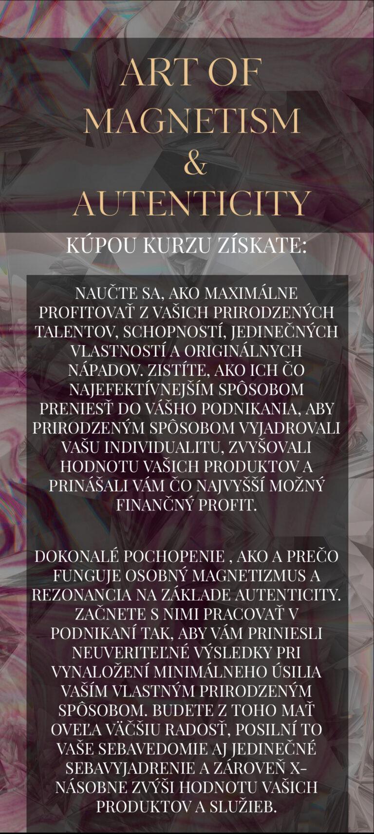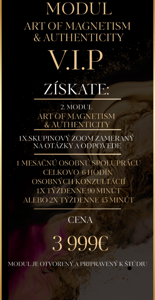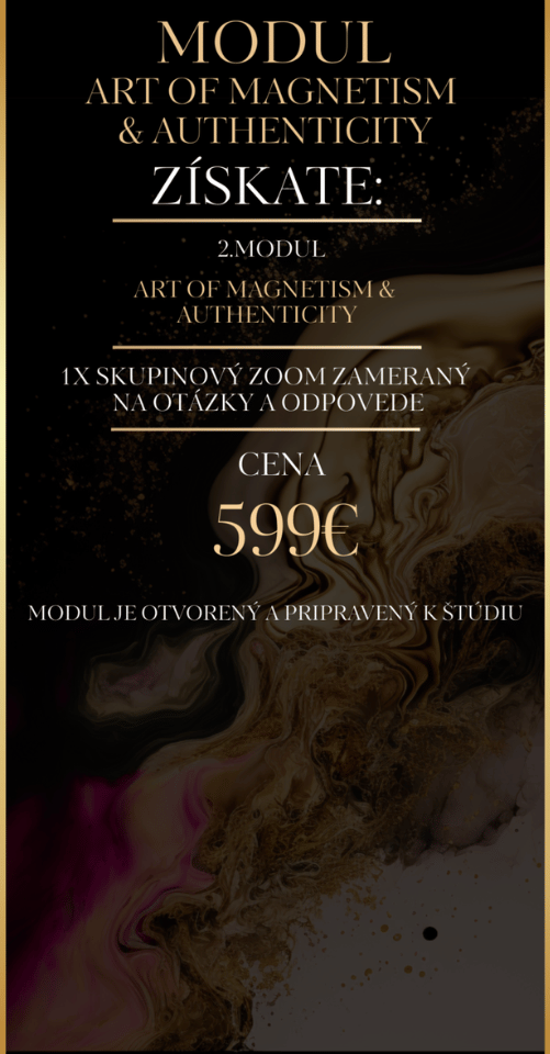 Získate praktické postupy, ako tieto techniky využiť vo svojom podnikaní, v sebaprezentácii, marketingu, tvorbe produktov a portfólia služieb, ale aj v bežnom každodennom živote. Aby ste maximálne využili svoje prirodzené vyžarovanie, autenticitu, magnetizmus a všetky svoje osobnostné dary a talenty, a dokázali ich maximálne monetizovať, pričom budete brať najvyšší ohľad na svoje vlastné pohodlie, priority a osobné hranice.